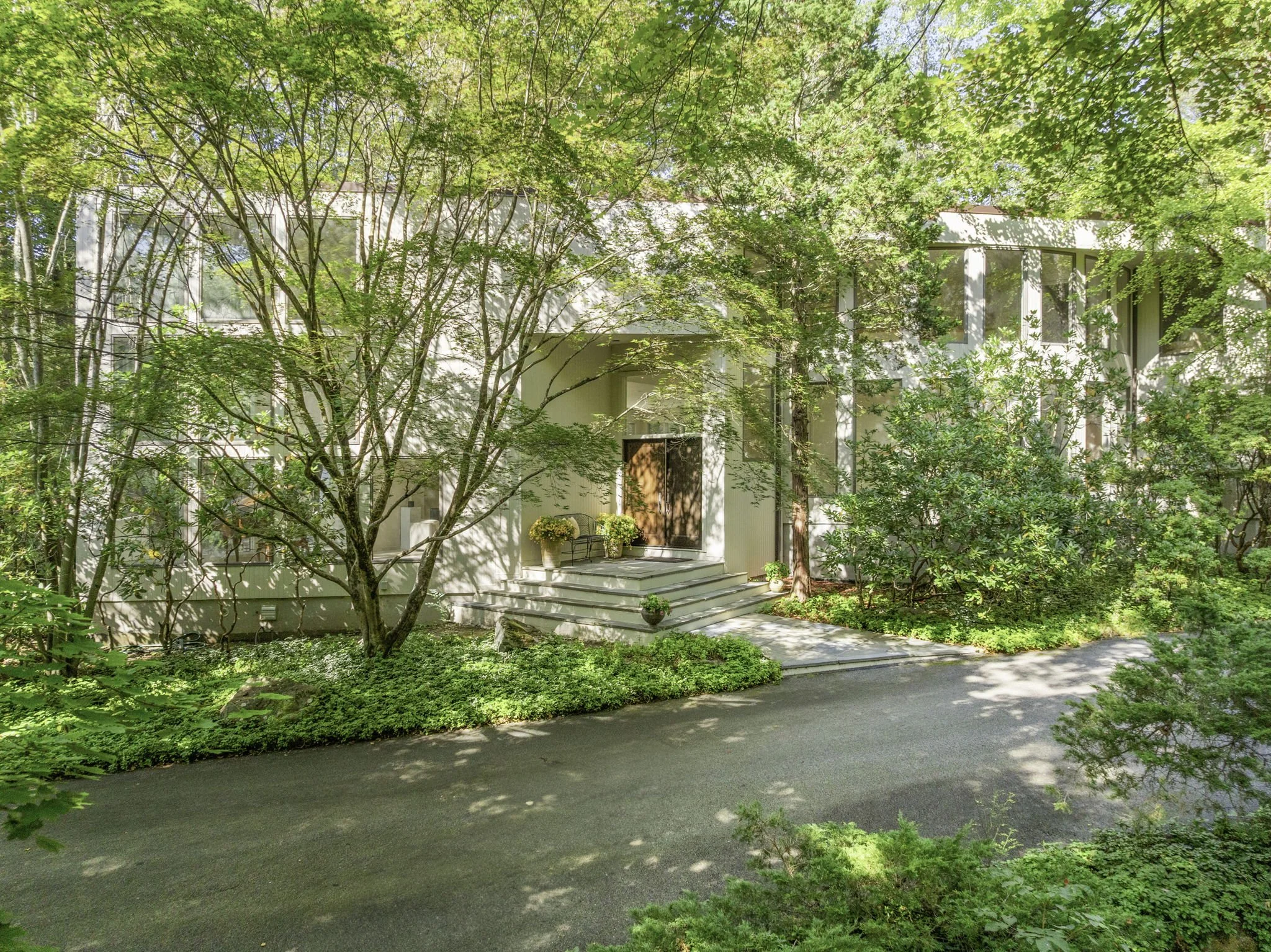 Soaring contemporary on a serene cul-de-sac, this 4-bedroom, 5216 sq ft home is defined by walls of glass and dramatic, oversized rooms. Set amidst rock outcroppings on 2.39 wooded acres with towering pines and babbling brook, this one-of-a-kind home in the acclaimed Chappaqua School District is situated in one of the most desirable neighborhoods offering both privacy and proximity. Welcome to your dream oasis, a stunning architectural-design home nested in a peaceful cul-de-sac neighborhood with a remotely controlled gated driveway. Gas and sewer, conveniently located near schools/shops, and express commuter train just minutes away. Curvilinear and geometric architectural elements uniquely define this house. This beautifully maintained property boasts an open-concept layout perfect for modern living and entertaining. The spacious living room that opens to a private deck enjoys ample natural light with walls of glass, cathedral ceiling, and a cozy fireplace, seamlessly connected to the dining and kitchen areas. The dining room provides dual access to decks. The chef’s kitchen features stainless steel appliances (new Sub Zero and Bosch), expansive countertops, a large center island, an adjacent breakfast area with dual access to decks, and plenty of cabinet space, making cooking a pleasure. The EIK opens directly onto a cathedral-ceiling family room with walls of glass, a raised hearth floor-to-ceiling stone fireplace, and built-in-bookcases. Gleaming hardwood floors and recessed lighting abound. A main-floor full bath with shower flows from an adjacent, separate laundry room with entry from the connected two-car garage. A dramatic, curvilinear staircase leads to the second level with wrap-around oak railings and breathtaking vistas of the private forest and brook in all seasons. Retreat to the primary bedroom suite that offers dual walk-in closets, an additional wall of closets, a separate windowed home office, a king-size bedroom, and an ensuite spa-style bath equipped with double sinks, a large storage vanity, a jetted tub, and a separate shower. Three more light-filled bedrooms and a hall bath complete the second floor. The gracious finished lower level provides nearly 1176 sq ft of included living space for play with a large recreation room and hobby area, a fully-stocked gym, as well as ample storage space and mechanicals. Step outside to a beautifully landscaped backyard, complete with five decks for dining al fresco or sitting privately in meditation, ideal for summer barbecues and gatherings. The property encompasses an extensive perennial garden teeming with pollinators every blooming season. Too many upgrades to mention include an electrified, remotely controlled, custom designed, galvanized wrought-iron driveway gate; digitized HVAC; generator; new roof (2017); newly painted decks and retaining walls; and resealed driveway. Impeccably maintained, in move-in condition. A one-of-a-kind architectural feat, a lifestyle of tranquility and privacy, a gem of a property that won’t last.